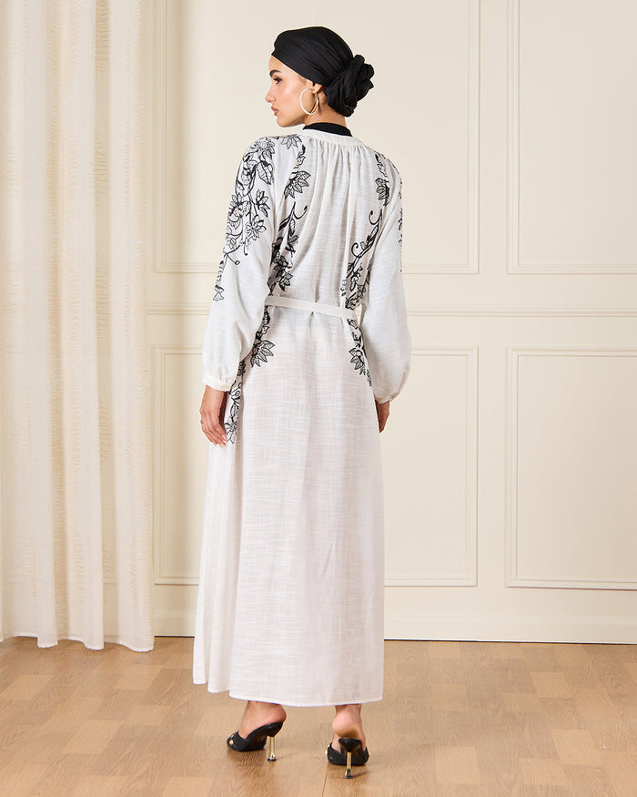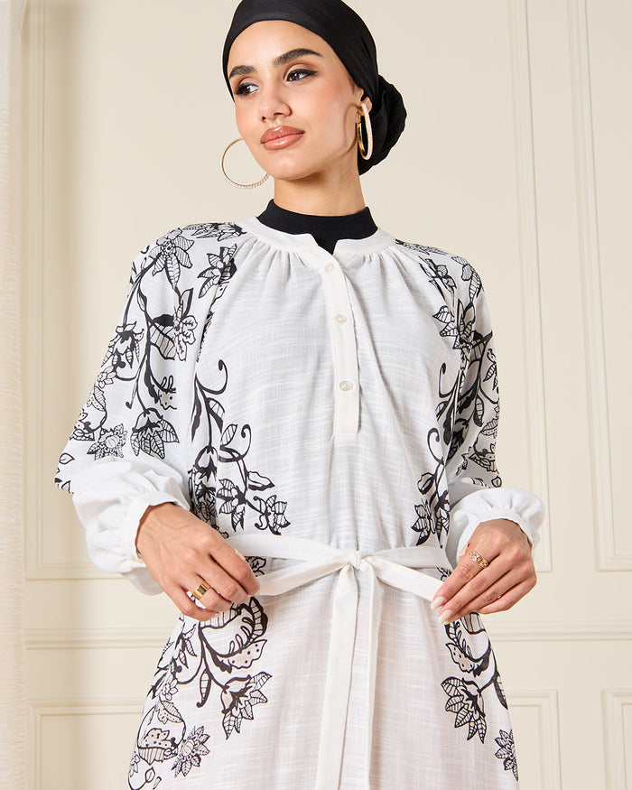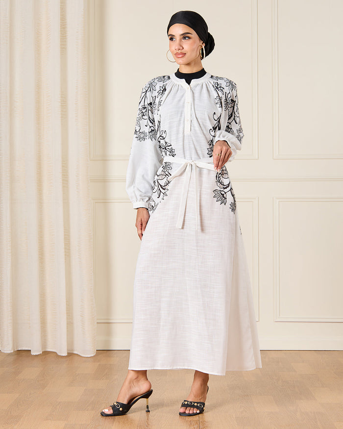 فستان قفطان مطبوع باللون الأبيض للنساء