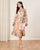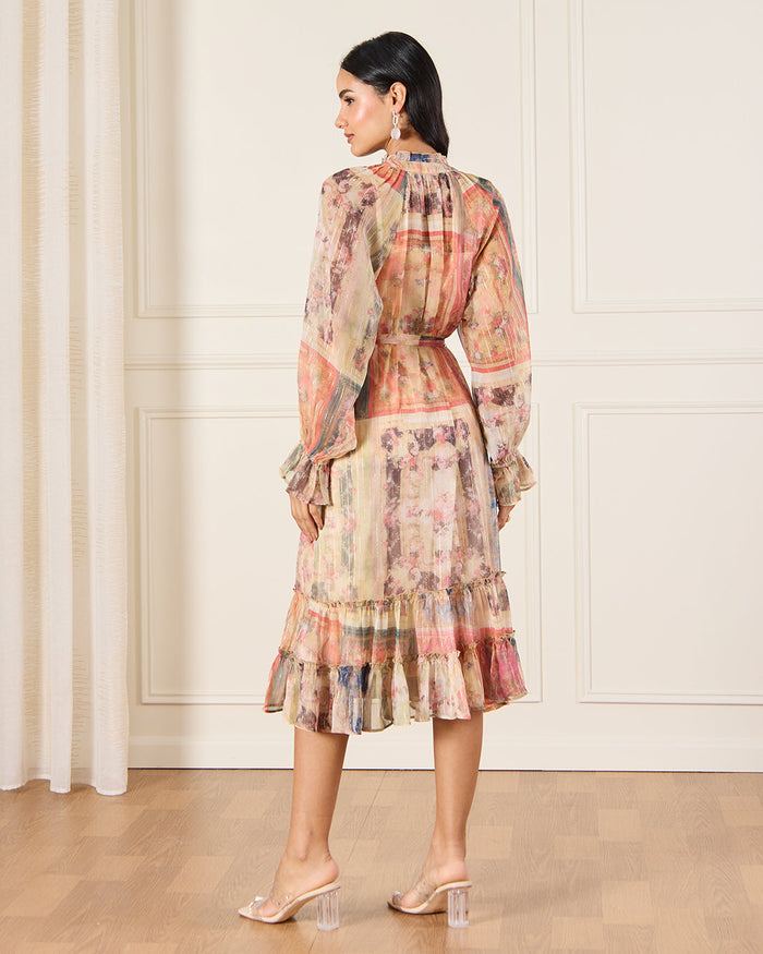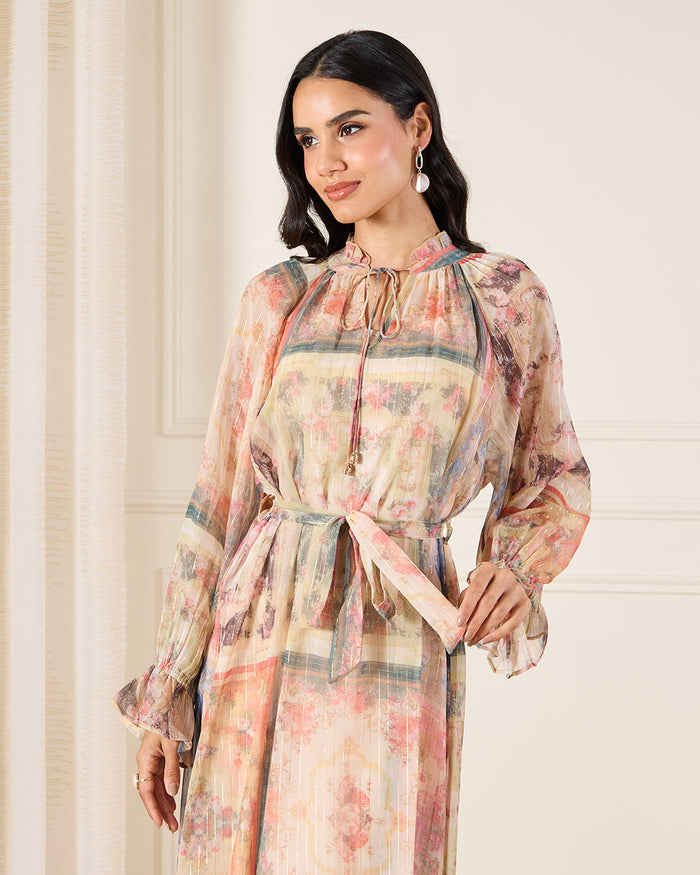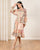 فستان بتفاصيل كشكشة وطبعة بوهيمية باللون البيج للنساء