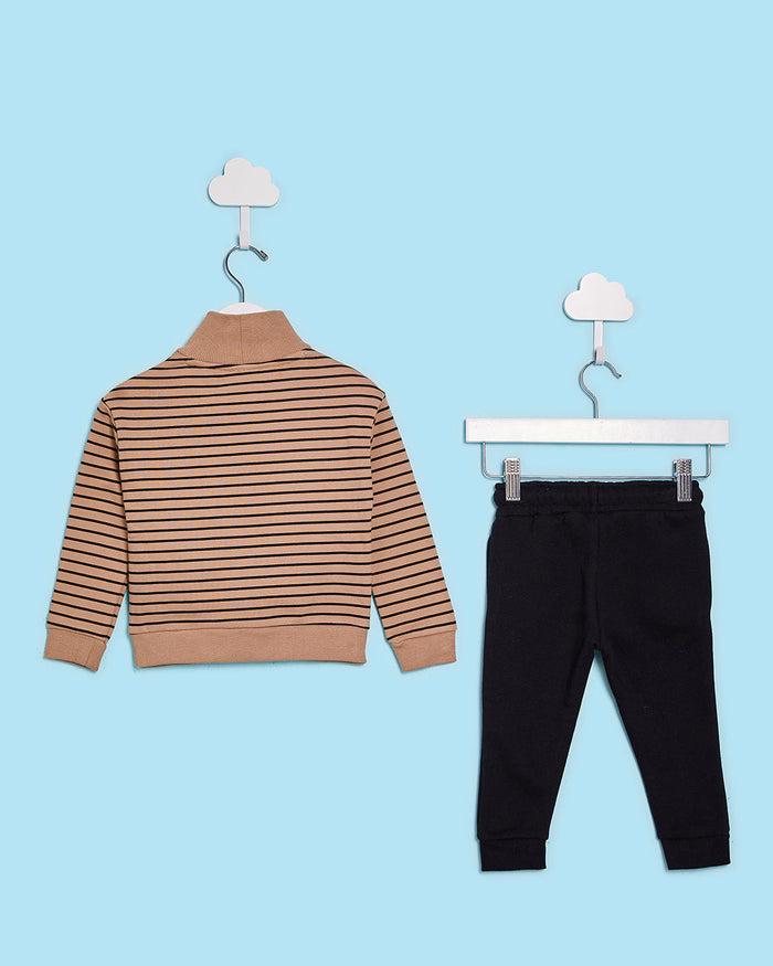 بدلة رياضية أولاد رضع مخططة بلون بيج بنصف سحاب وياقة عالية