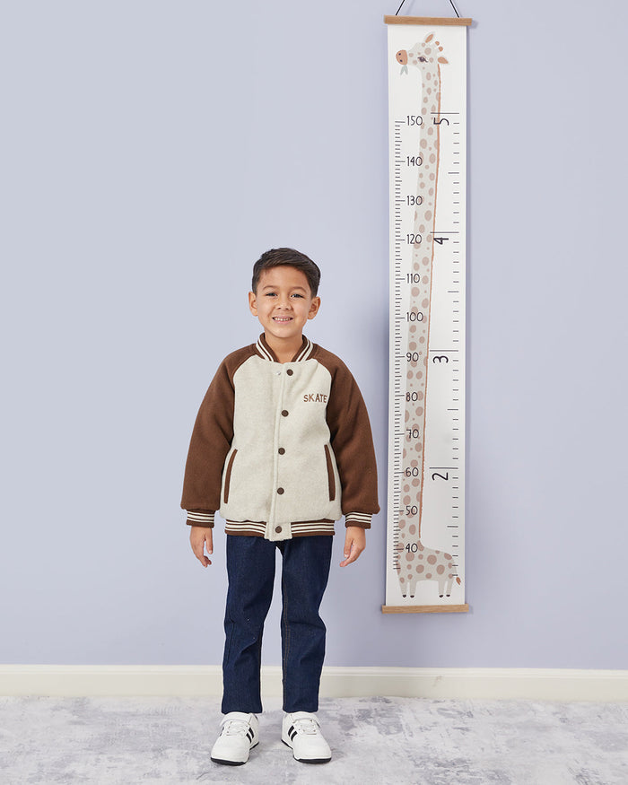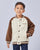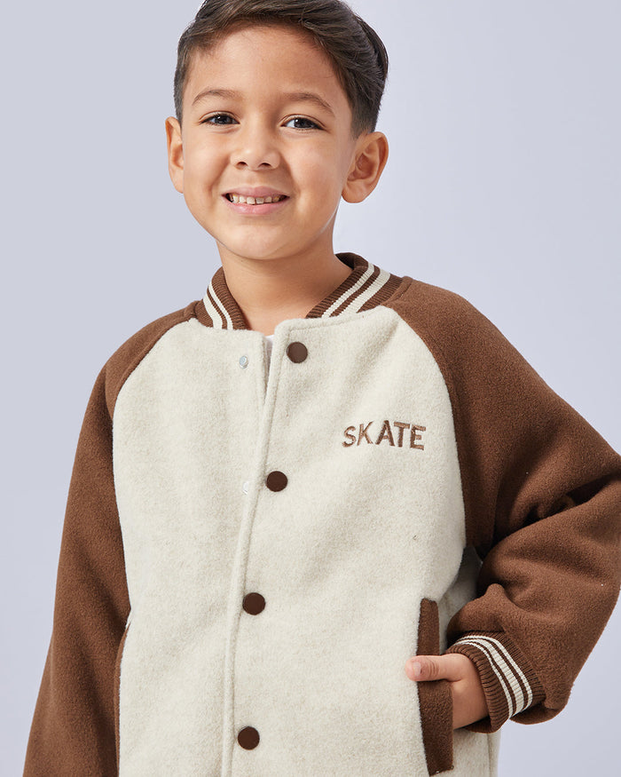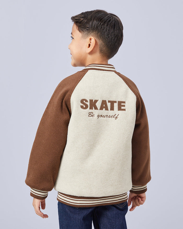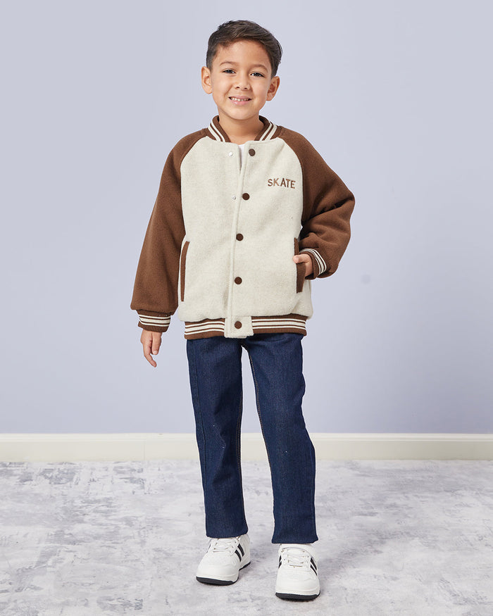 Keep him warm and stylish with this varsity-inspired jacket. Featuring contrast sleeves, striped trims, and snap-button closure, it adds a sporty touch to his casual looks. Perfect for layering on chilly days.
