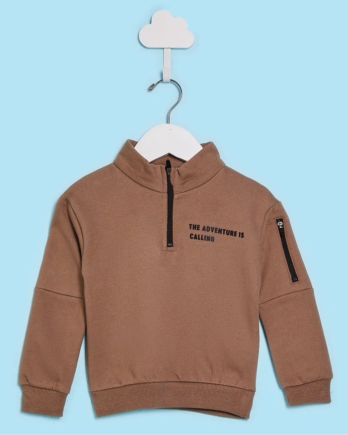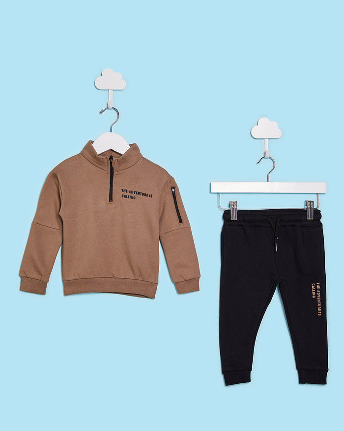 بدلة رياضية مريحة للأولاد الرضع، باللون البني، تتكون من سويت شيرت بياقة عالية ونصف سحاب مع بنطال طويل متناسق. تصميم مثالي للحركة واللعب اليومي.