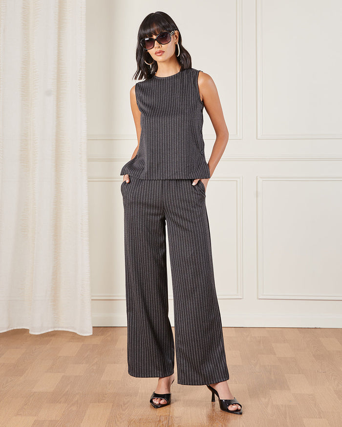 بنطلون مخطط بقصة واسعة باللون الرمادي الداكن للنساء