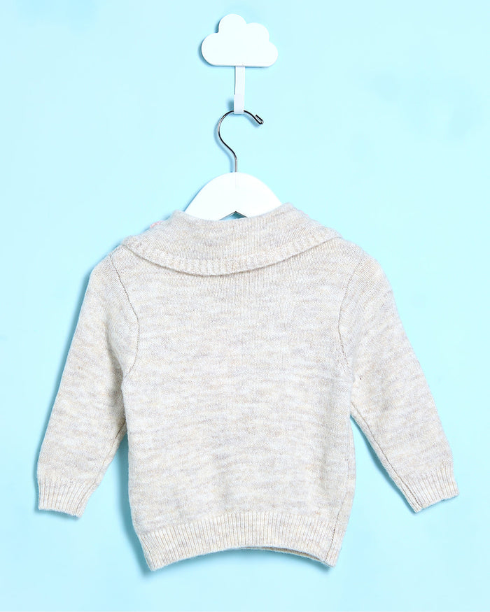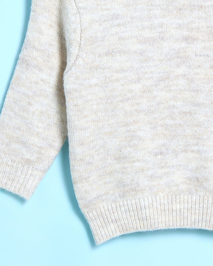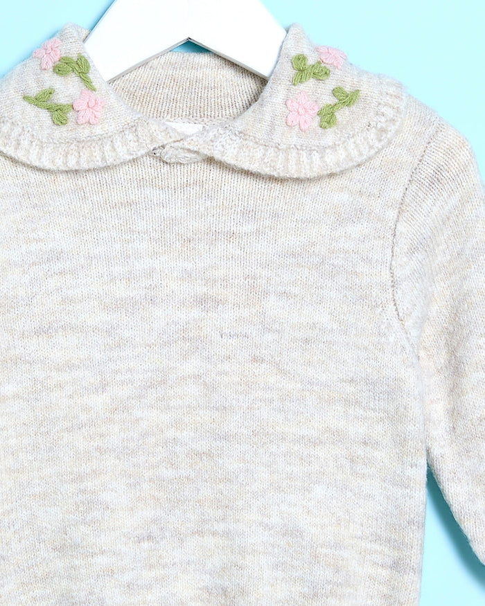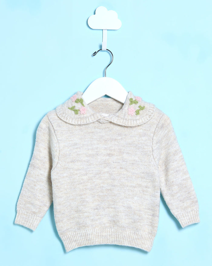 بلوفر كلاسيكي بلون بيج ناعم مزين بياقة مطرزة بنقوش زهرية رقيقة. يمنح صغيرتك الدفء والراحة مع إطلالة أنيقة تناسب الأيام الباردة.