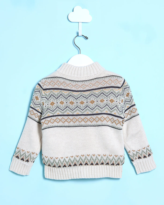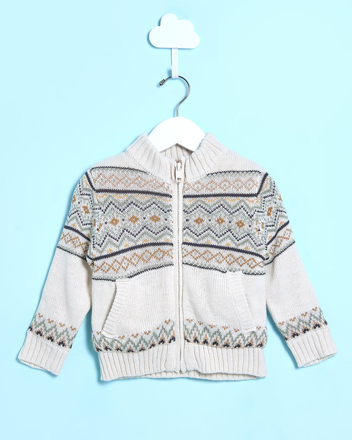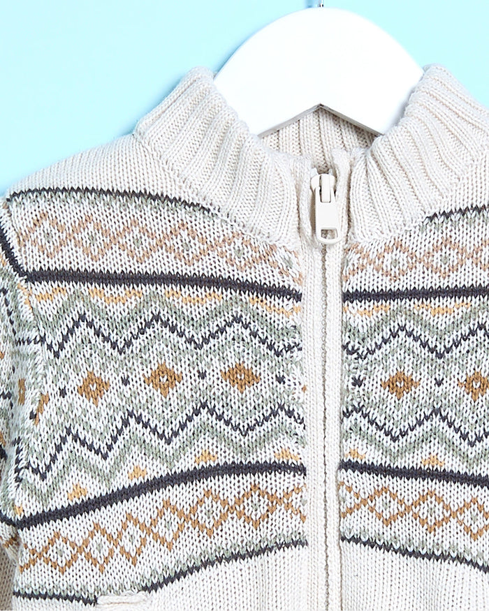 كارديغان مريح باللون البيج بنقشة هندسية تقليدية، مثالي لإطلالة دافئة في الشتاء. يتميز بسحّاب أمامي وقماش ناعم يمنح طفلك دفئاً وأناقة.
