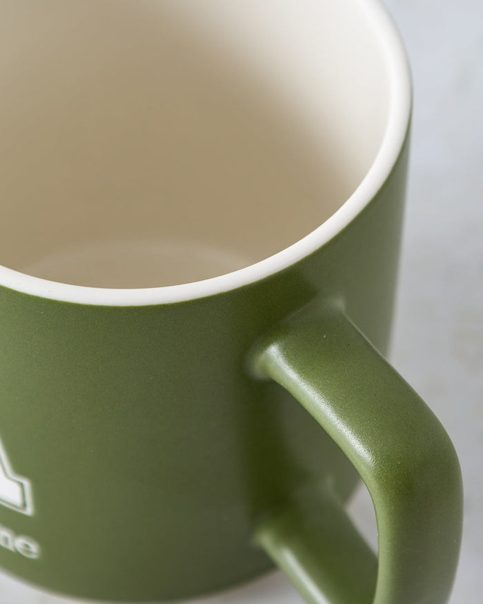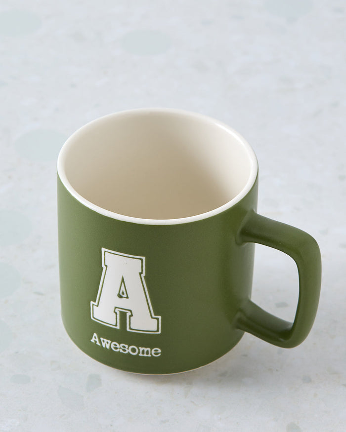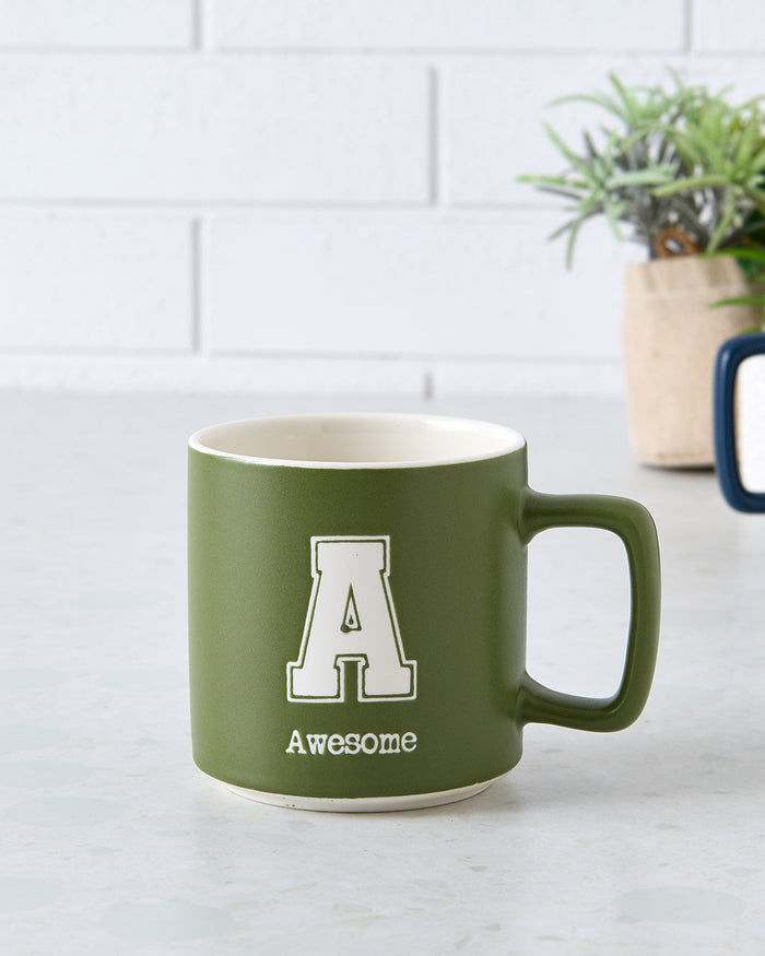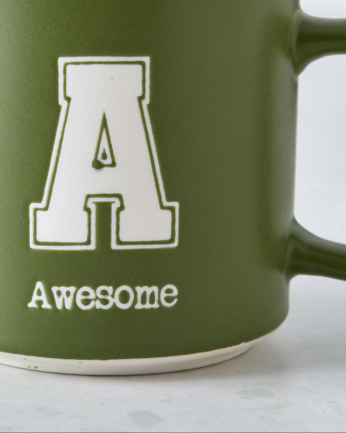 كوب أنيق باللون الأزرق الداكن مزين بحرف "A" وكلمة "Awesome" في الأمام. مثالي للاستمتاع بمشروباتك الساخنة المفضلة بلمسة عصرية.