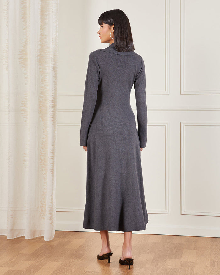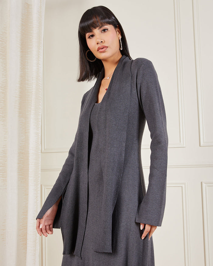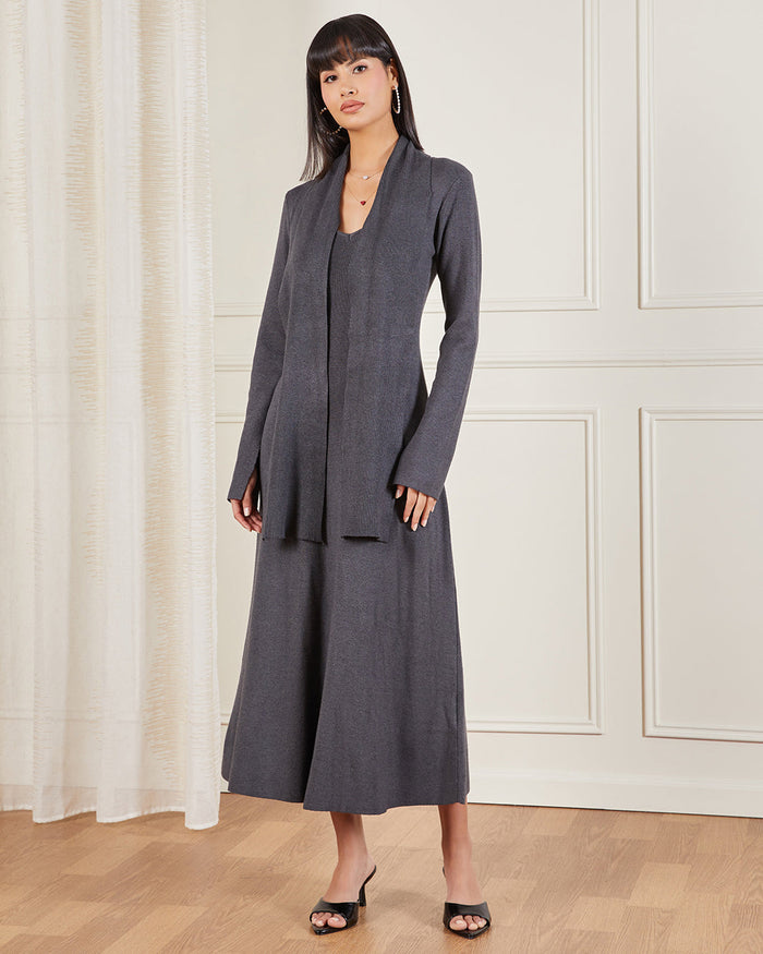 أناقة عصرية بلمسة دافئة مع فستان محبوك باللون الرمادي الداكن. يتكون من فستان بأكمام طويلة مع وشاح متناسق لإطلالة أنيقة ومتكاملة. مثالي للمشاوير اليومية أو السهرات البسيطة بإحساس من الرقي والراحة.