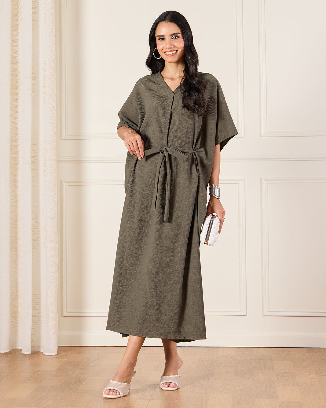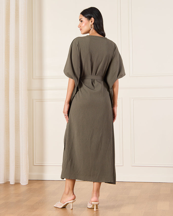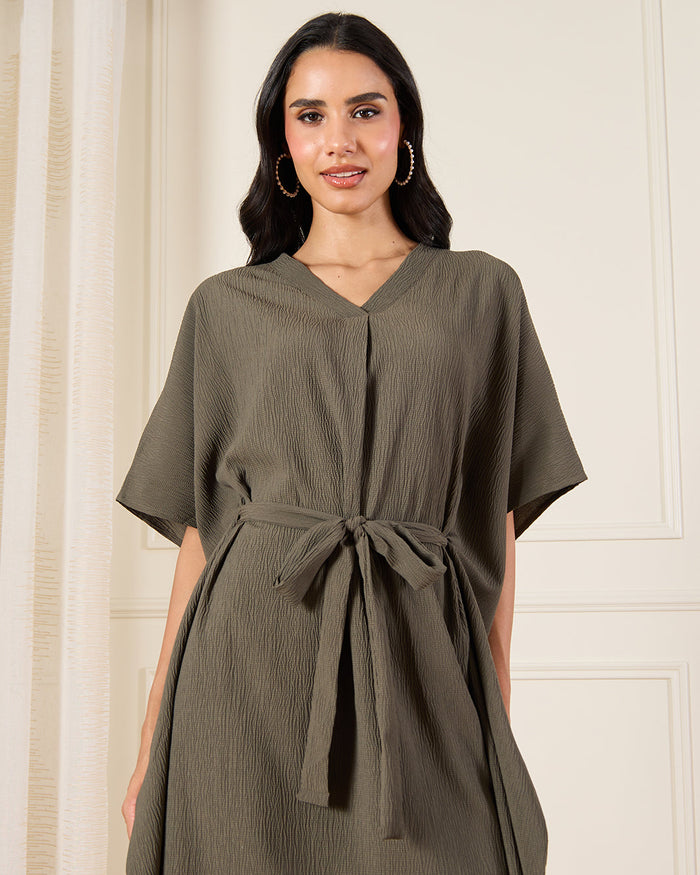 فستان بحزام باللون الزيتي للنساء
