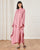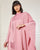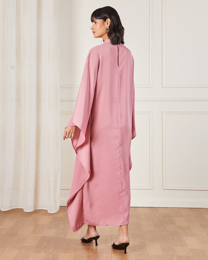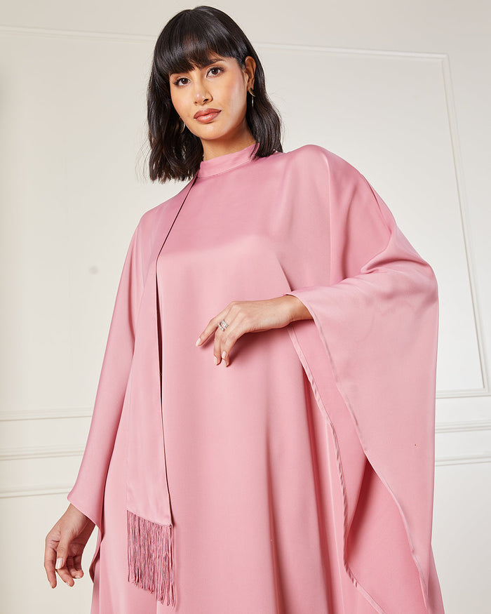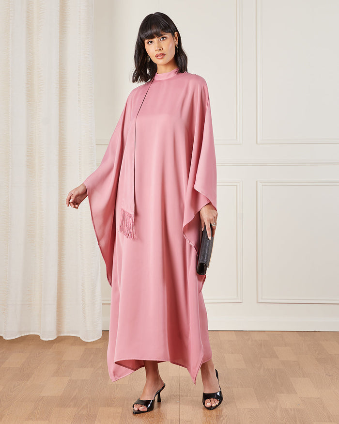 فستان قفطان أنيق باللون الوردي مع أكمام واسعة متدفقة وياقة مرتفعة، مزين بلمسة أنيقة من الشرّابات لإطلالة راقية وناعمة. مثالي للسهرات والمناسبات الخاصة.