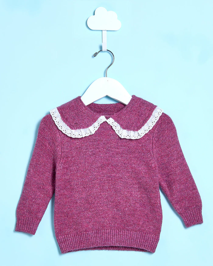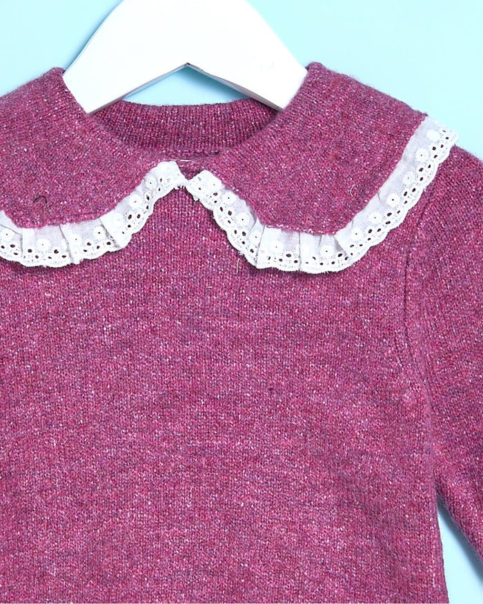 يتميز هذا البلوفر الأنيق بتصميم دافئ ولمسة من الرقي بفضل ياقة الدانتيل المزخرفة. خيار مثالي للإطلالات الأنيقة في الأيام الباردة أو المناسبات العائلية.