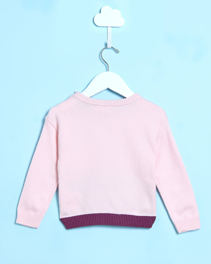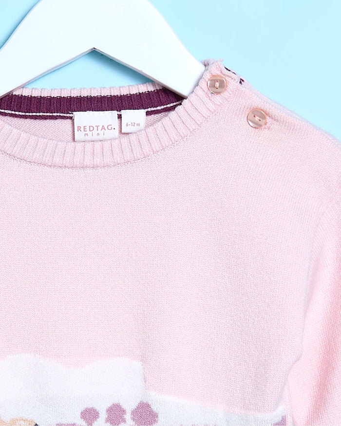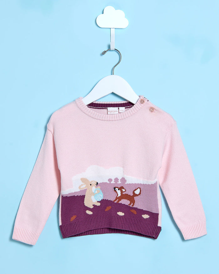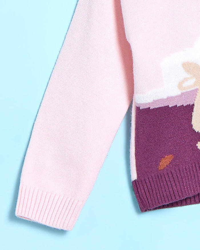 أضيفي لمسة من الدفء واللطافة لإطلالة صغيرتك مع هذا البلوفر الوردي الناعم والمزين بتصميم أرنب وغزال. مثالي لأيام الشتاء الباردة ويضفي لمسة مرحة على مظهرها اليومي.