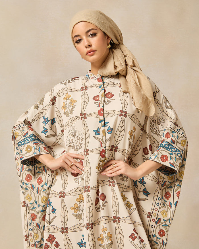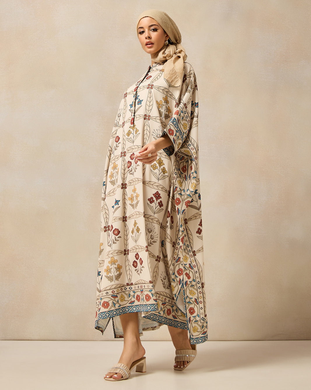 This floral printed kaftan dress is a timeless piece that blends comfort with effortless elegance. Featuring a loose and airy design, it allows for maximum movement while maintaining a chic and graceful look. The floral prints enhance its charm, making it suitable for casual gatherings, summer outings, or lounging in style. Crafted from lightweight fabric, it provides breathability and ease, ensuring you stay comfortable all day.