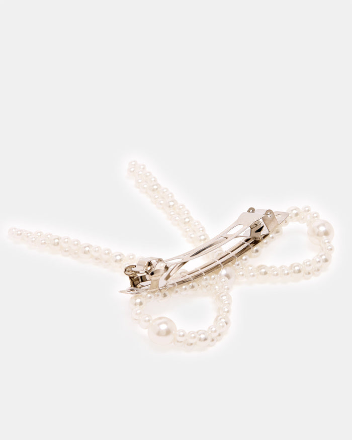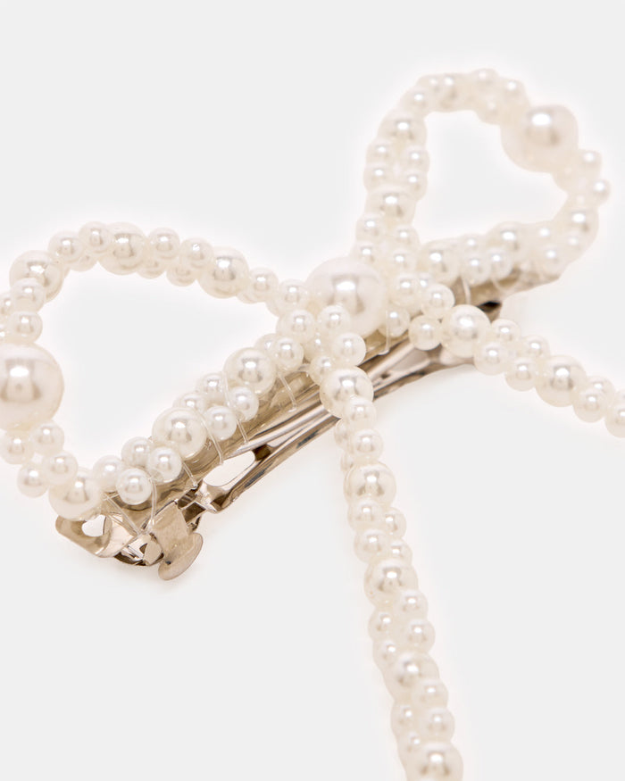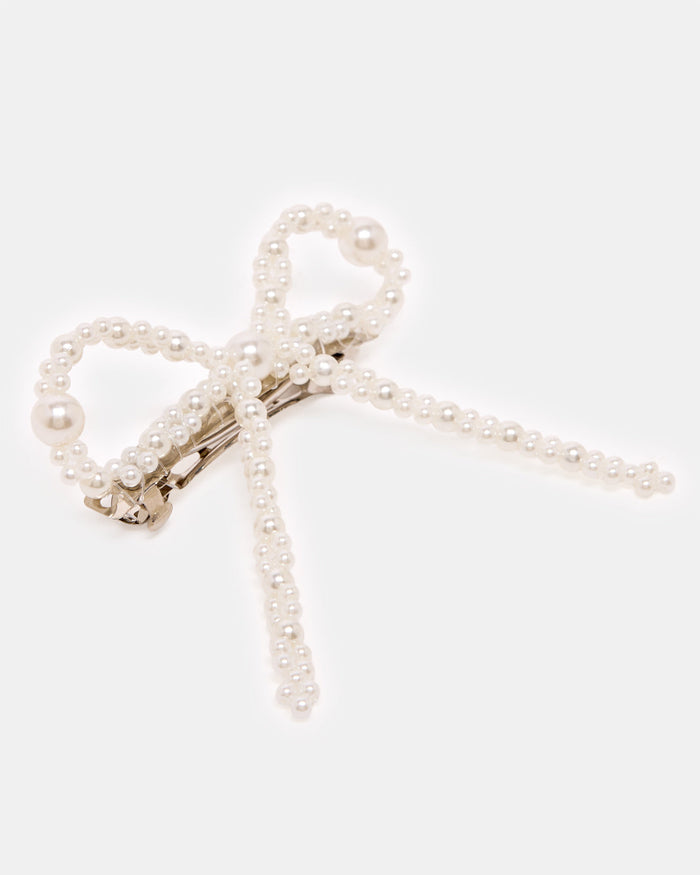 Elegant and timeless, this pearl-embellished bow clip adds a refined touch to her hairstyle.