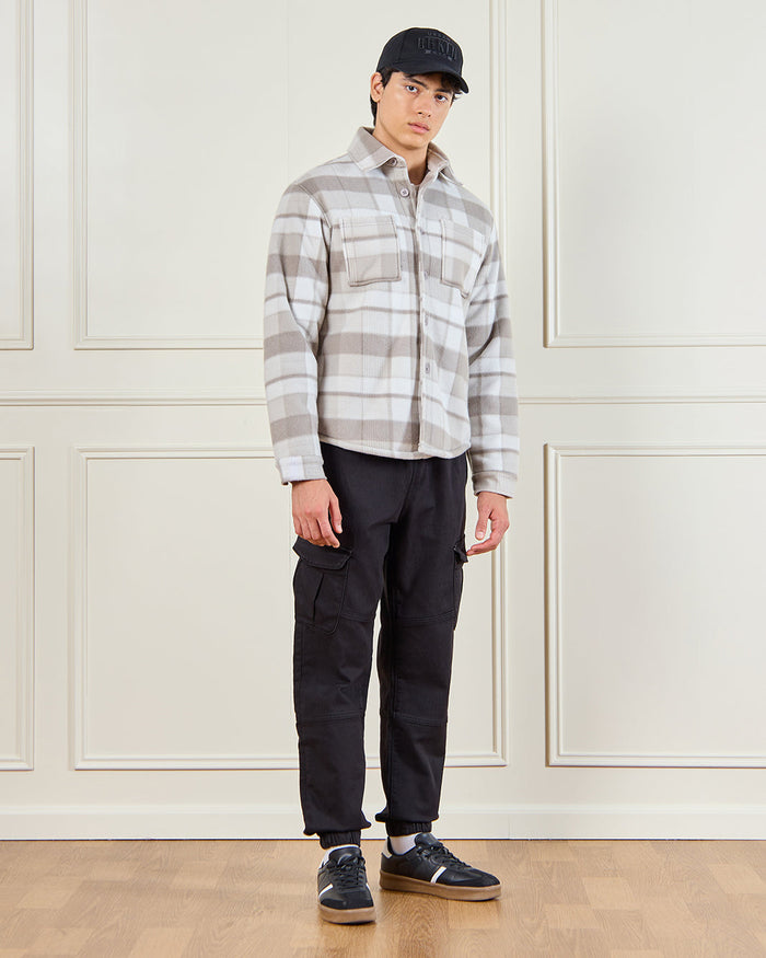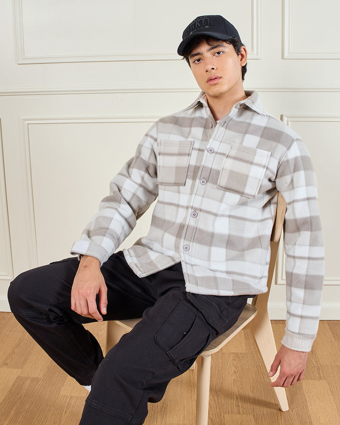 A versatile beige checked shirt jacket that blends warmth and style. With front flap pockets and soft fabric, it’s ideal for layering on chilly days.