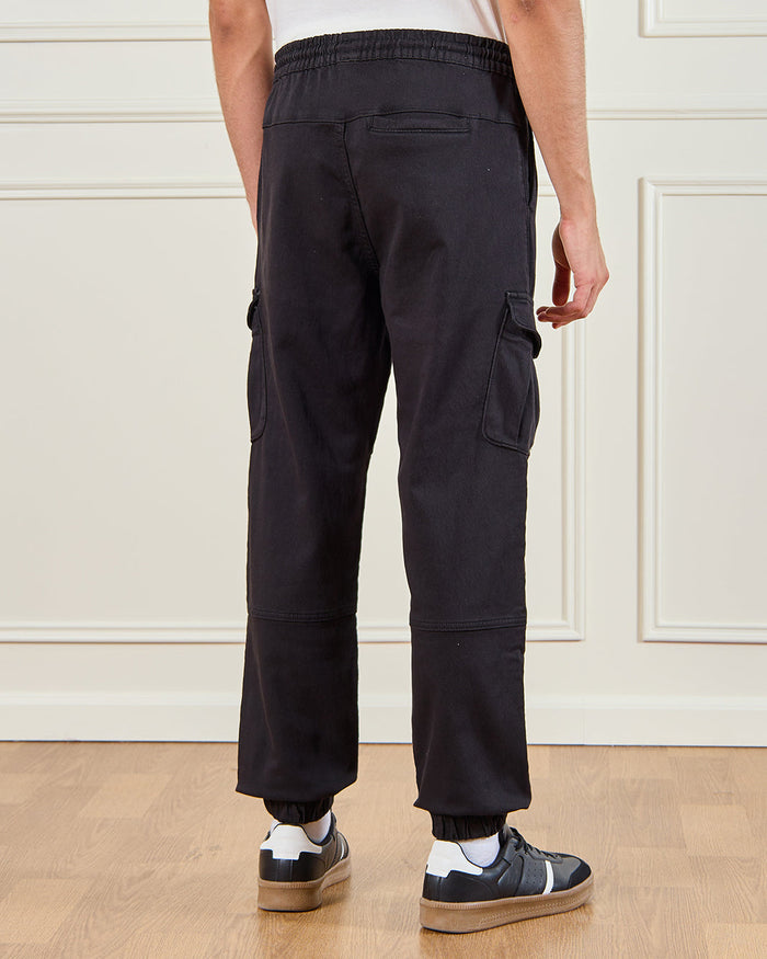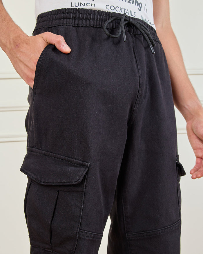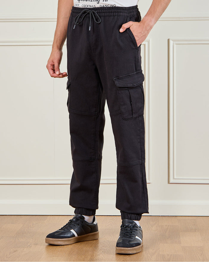 Redefine casual comfort with these black cargo jogger pants. Designed with multiple utility pockets, an elasticated drawstring waist, and cuffed hems for a modern street-style vibe, ideal for daily wear or weekend outings.