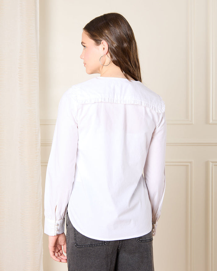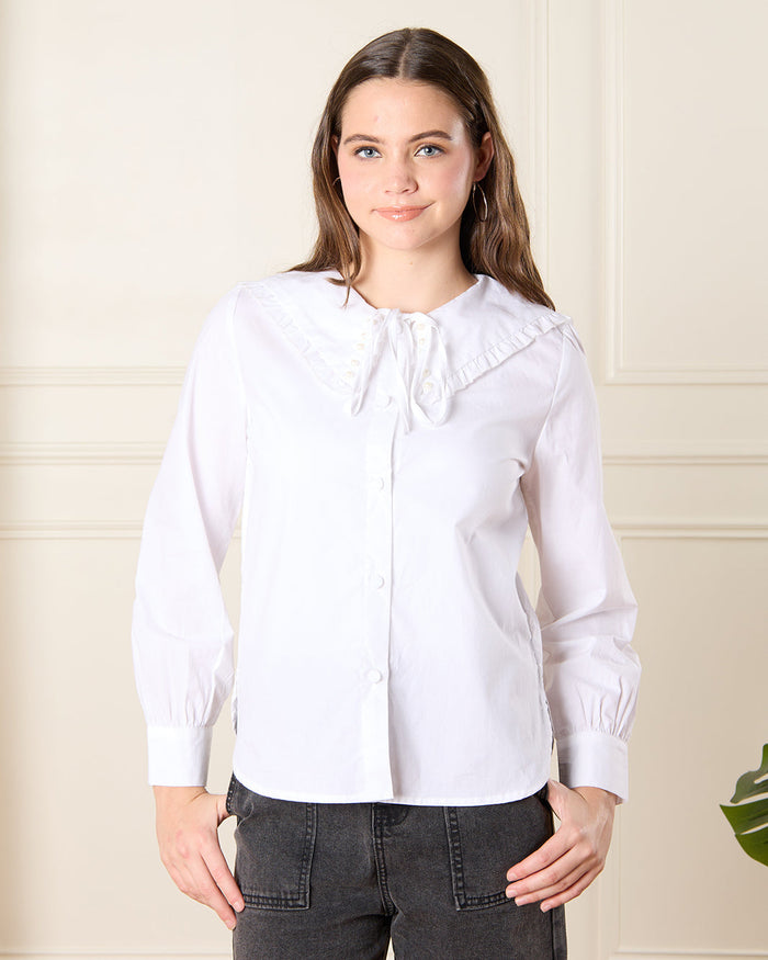 Introduce timeless charm to her wardrobe with this shirt featuring a Peter Pan collar and long sleeves. This elegant piece combines a formal design with a modern twist, making it perfect for both casual and slightly dressier occasions.